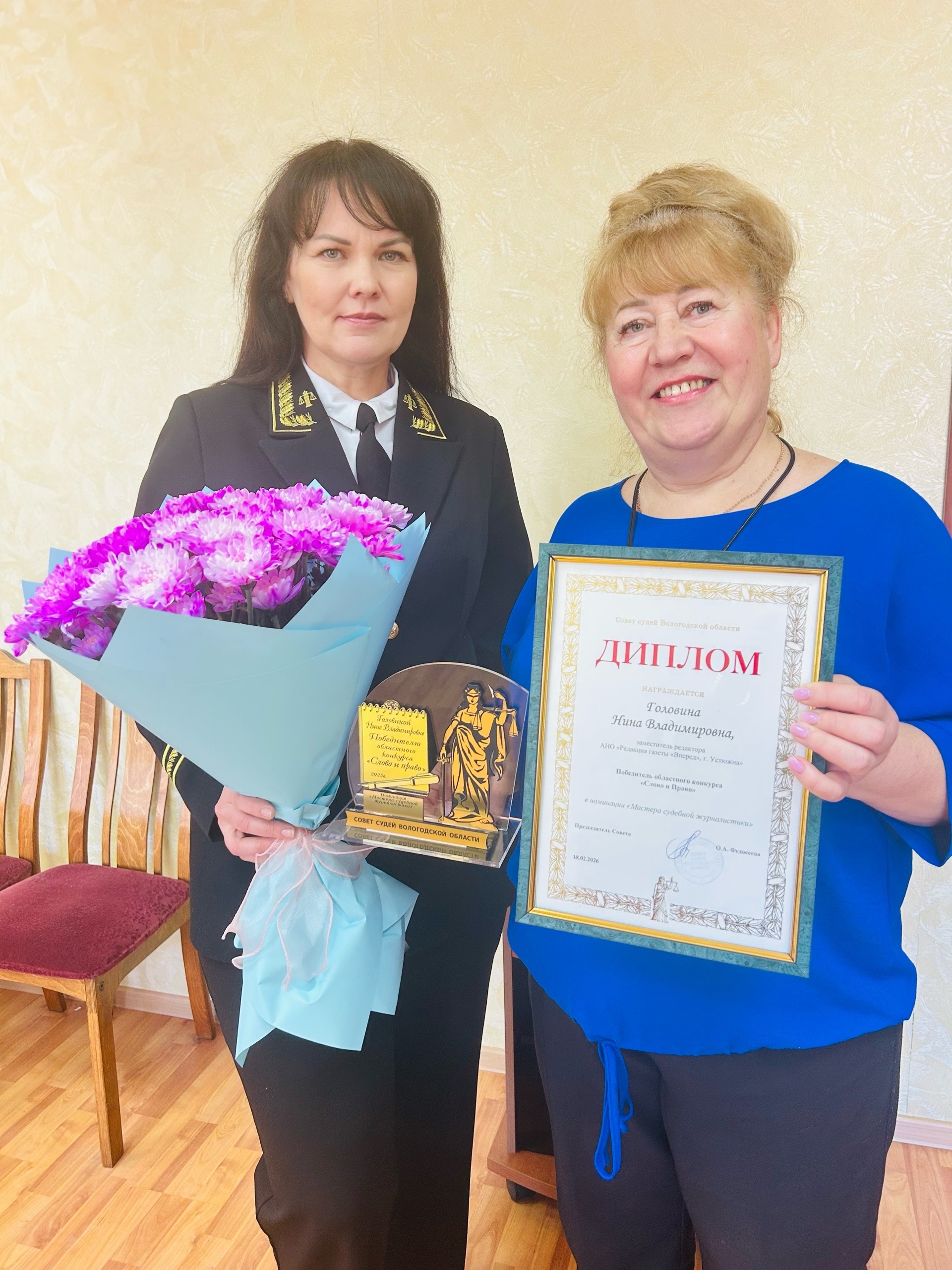 19 марта 2026 года председатель Устюженского районного суда Копылова Н.В. в торжественной обстановке вручила награду победителю областного конкурса «Слово и Право» в номинации «Мастера судебной журналистики» заместителю редактора АНО «Редакция газеты «Вперед» Головиной Нине Владимировне. Наталья Валерьевна поблагодарила Нину Владимировну за многолетнее сотрудничество, отметила оригинальный авторский стиль ее статей, высокий профессионализм, искрометность, пожелала творческих успехов и дальнейшего взаимодействия по освещению деятельности суда и органов судейского сообщества. ![]() |