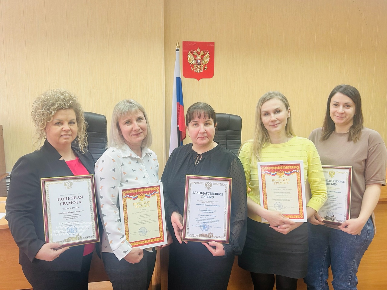06 марта 2025 года в преддверии Международного женского дня – 8 марта в Устюженском районном суде состоялось торжественное собрание с судьями и работниками аппарата суда, в ходе которого прозвучали поздравления с профессиональным праздником, а также вручены награды: - Почетной грамотой Вологодского областного суда за многолетний добросовестный труд, оперативность и безупречное исполнение должностных обязанностей награждена Бондарева Наталья Борисовна, помощник председателя суда; - Благодарственным письмом председателя Вологодского областного суда за многолетний добросовестный труд и ответственный подход к исполнению должностных обязанностей награждены Ракутина Ольга Владимировна, судья Устюженского районного суда, Ловчикова Наталья Павловна, консультант суда; - Почетной грамотой председателя Устюженского районного суда за добросовестный труд, ответственный и профессиональный подход к исполнению должностных обязанностей награждены Погодина Светлана Александровна, администратор суда, Смирнова Вера Александровна, секретарь судебного заседания. ![]() |